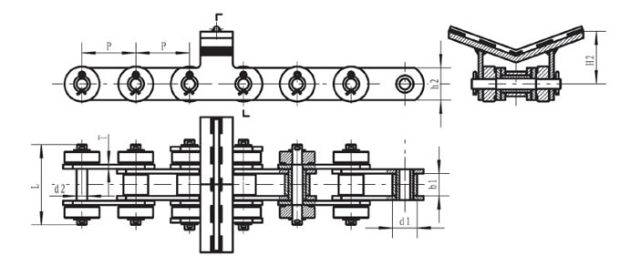 | Pitch P (mm) | Inner width of inner link b1 (mm) | Diameter of roller d1 (mm) | Diameter of pin d2 (mm) | Length of pin (mm) | Height of sidebar h2 (mm) | Thickness of sidebar T (mm) | Height of top chain H2 (mm) | Tensile strength Q (KN) |