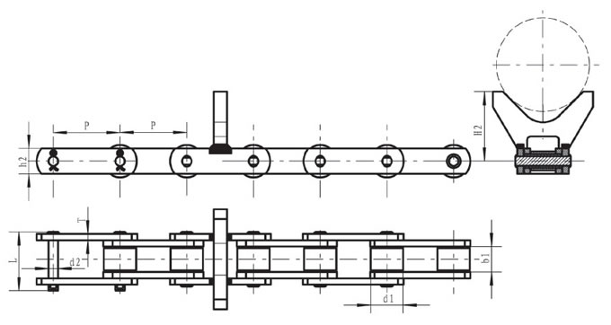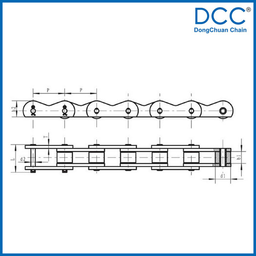 Pitch P (mm)Inner width of inner link b1 (mm)Diameter of roller d1 (mm)Diameter of pin d2 (mm)Length of pin L (mm)Height of sidebar h2 (mm)Thickness of sidebar T (mm)Height of attached plate H2 (mm)Tensile strength Q (KN)
