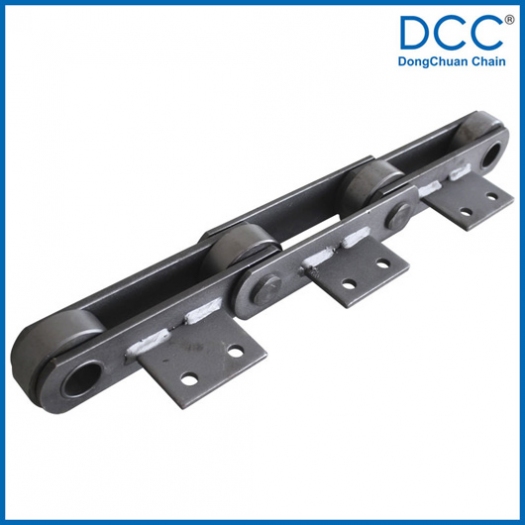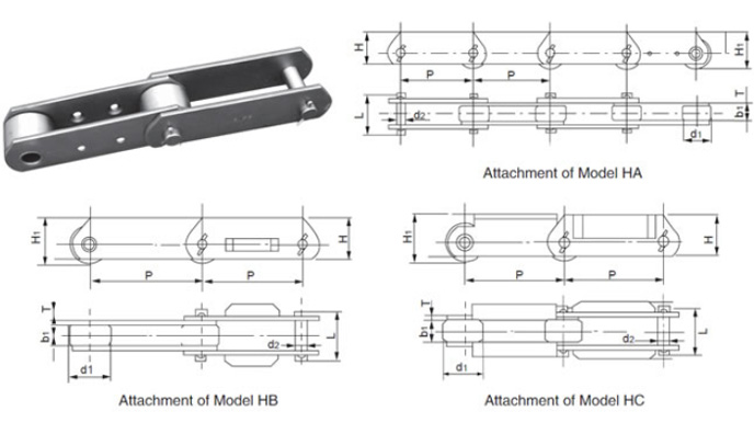 | Pitch P (mm) | Inner width of inner link b1 (mm) | Diameter of pin d2 (mm) | Diameter of roller d1 (mm) | Height of sidebar h2 (mm) | Thickness of sidebar T (mm) | Pitch of attachment L (mm) | Central distance of attachment L1 (mm) | Hole diameter of attachment d4 (mm) | Height of attached side plate h4 (mm) | Tensile strength (KN) |