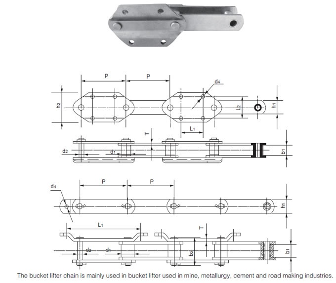 Chain No.Pitch P (mm)Inner width of inner link b1 (mm)Diameter of roller d1 (mm)Diameter of pin d2 (mm)Height of sidebar h2 (mm)Thickness of sidebar T (mm)Hole height of attached plate (mm)Central distance of attached plate L1(mm)Hole diameter of attached plate d4 (mm)Tensile