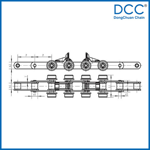 Pitch P (mm)Inner width of inner link b1 (mm)Diameter of roller d1 (mm)Diameter of pin d2 (mm)Length of pin L (mm)Height of sidebar h2 (mm)Thickness of sidebar T (mm)Height of attached plate H2 (mm)Tensile strength Q (KN)