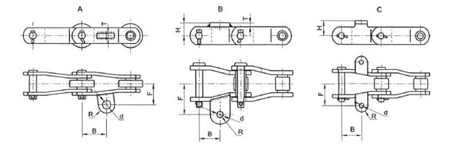 Matching chain no.H (mm)T (mm)B (mm)F (mm)R (mm)D (mm)Attachment type